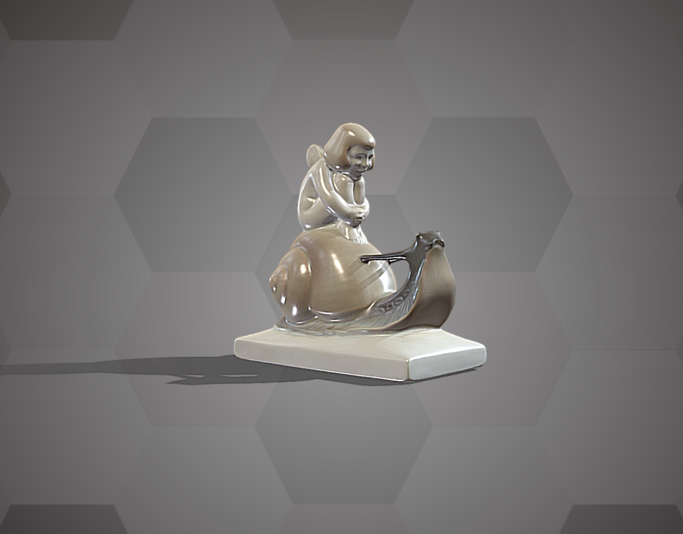 3D model of the ceramic figurine “Snailmail” from the period of Art Noveau (Jugendstil) which is part of the Uetz collection. It shows a small, winged fairy sitting on a land snail, holding her legs close to her body. A green stamp on the bottom reads "Rosenthal" with the additon of "Selb-Bavaria". "Snailmail" or "Schneckenpost" in German, was presumably designed by Albert Caasmann in 1913.
