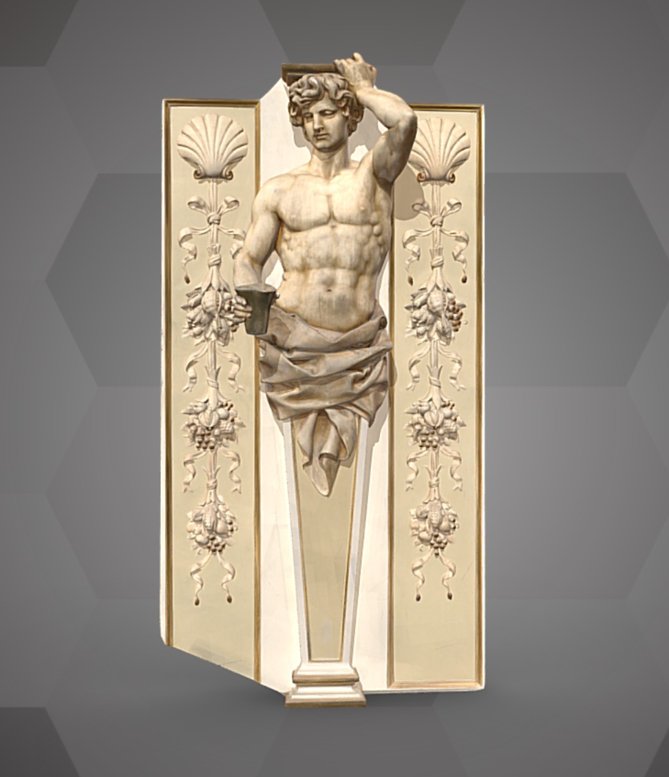 3D scan of a figure holding a tin cup, that is part of the architecture in Hall 6 of the NHM Vienna. It represents the chemical element Tin (Sn). Tin was long seen as “the silver of the ordinary man” and was used for the creation of dishes. Previously lead was often used as an alloy, but some people reacted with health problems and so lead-dishes went out of fashion and tin was used instead. All figures in Hall 6 of the NHM Vienna were created by Edmund Hofmann.