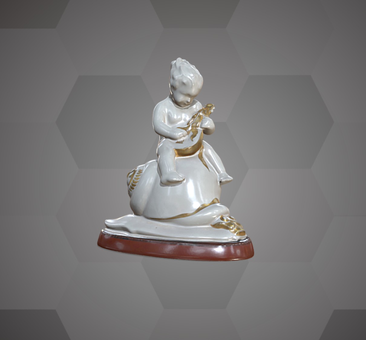 3D model of the ceramic figurine “Little putto” from the period of Art Noveau (Jugendstil) which is part of the Uetz collection. This ceramic figure shows a little cherub sitting on a land snail and playing the guitar. The snail shell is clearly visible, while the soft body of the snail is only indicated. Given, that this object comes from a private collection, its origin is unknown to the museum at this point.